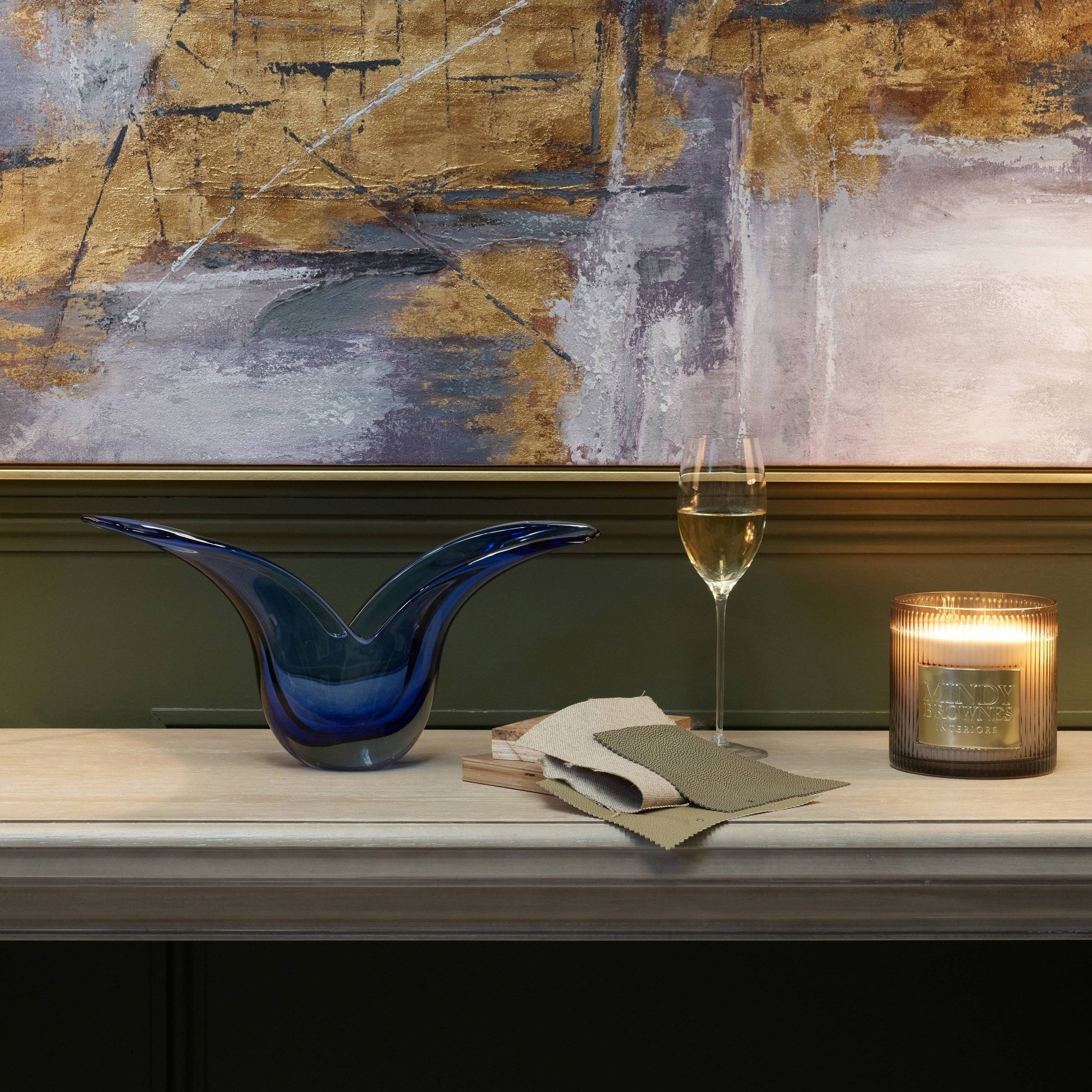 The Swan Vase is a striking artistic piece defined by its flowing form and vivid blue and clear glass. Its sweeping shape evokes the graceful movement of a swan in motion making it both a functional vase and a sculptural statement. The rich blue hue captures light with remarkable depth creating a sense of vibrancy and fluid elegance.