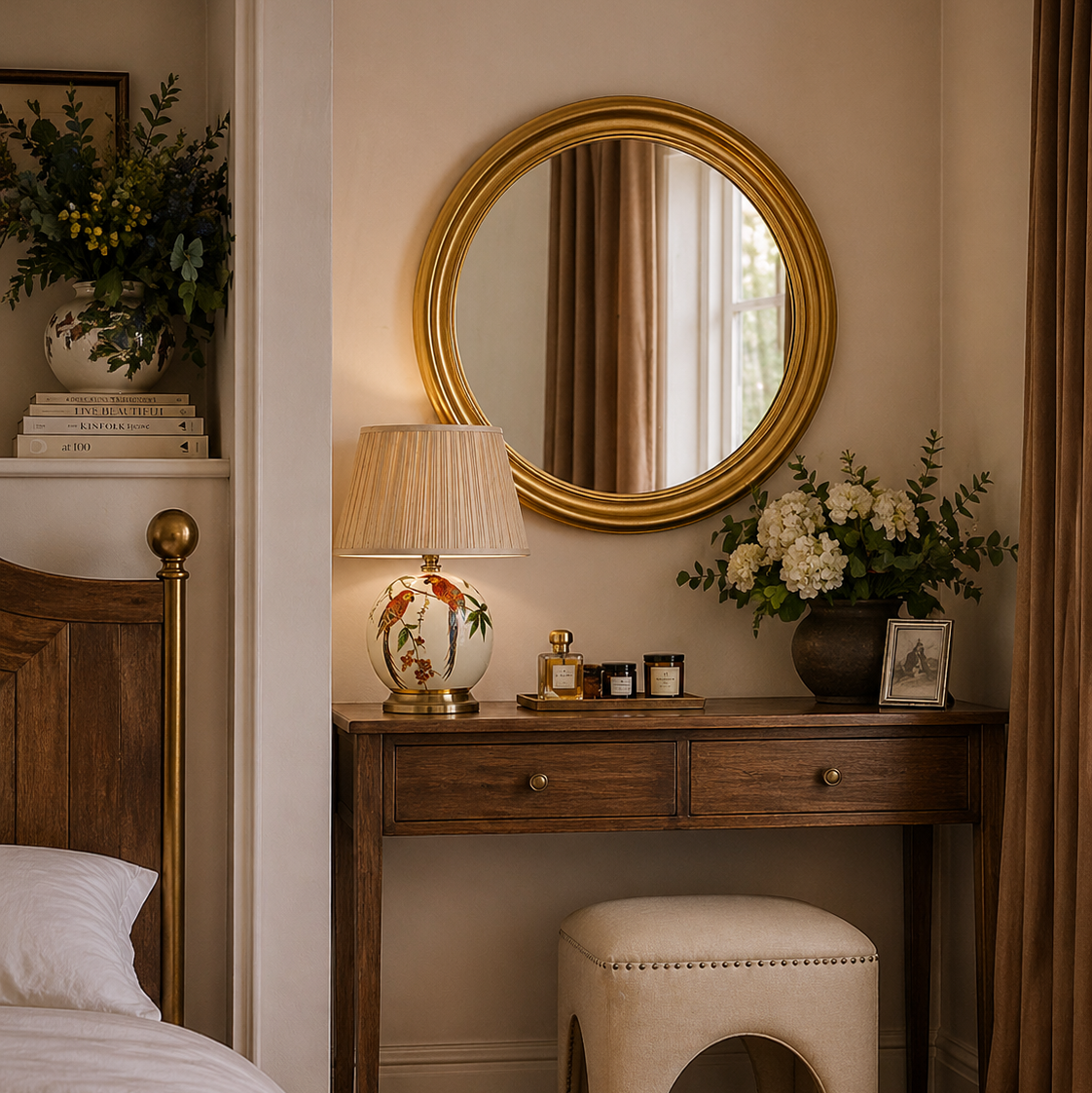 The Beth Mirror features a classic round design with a lustrous gold frame that adds warmth and refined elegance. Its soft shape enhances light and brings balance, while the polished finish creates a subtle sense of luxury.