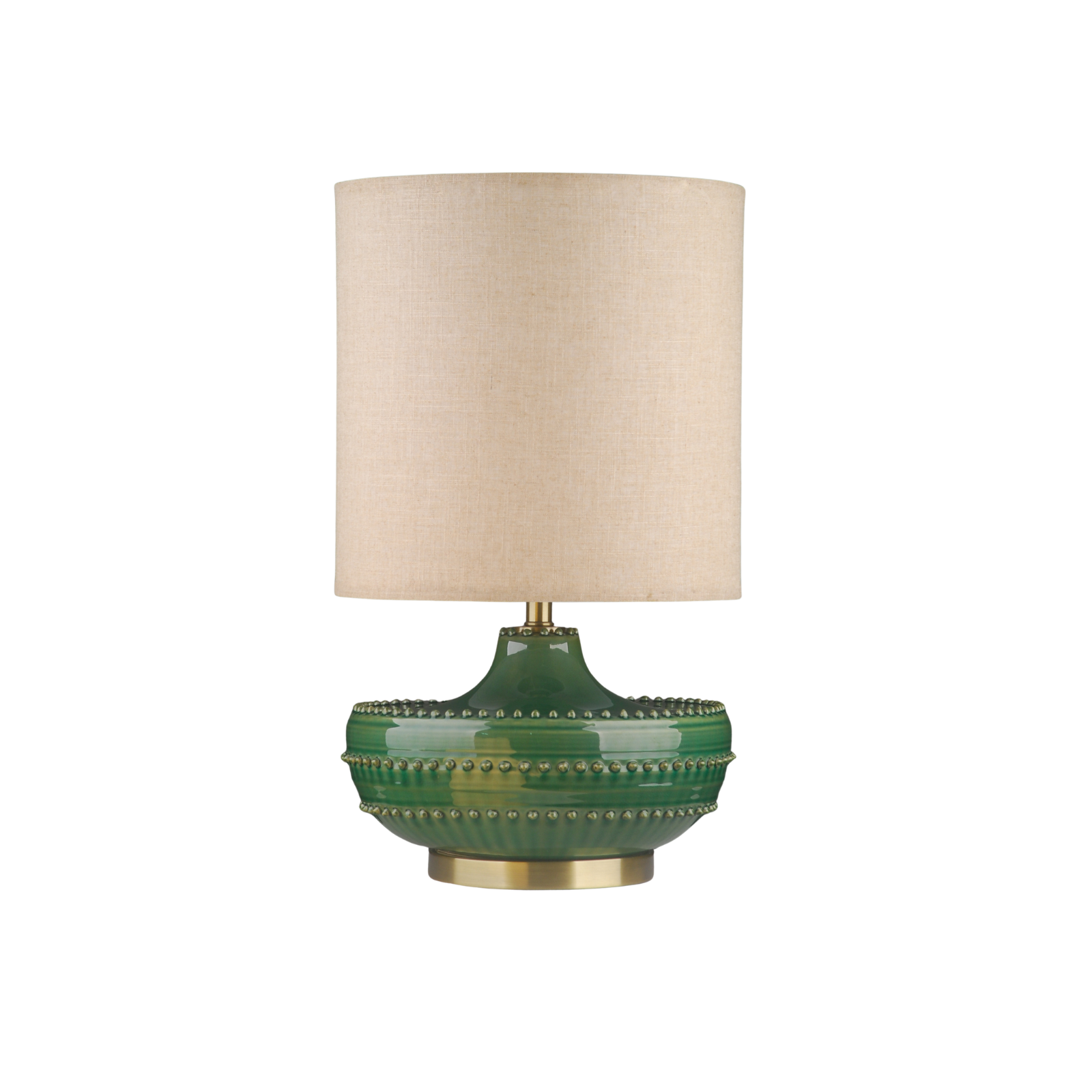The Mia Lamp brings richness and character through its deep green glazed ceramic base and beautifully detailed form. The rounded silhouette is enhanced with subtle raised banding and delicate stud detailing that adds texture and visual depth. The glossy finish enriches the colour and gives the piece a luxurious feel.