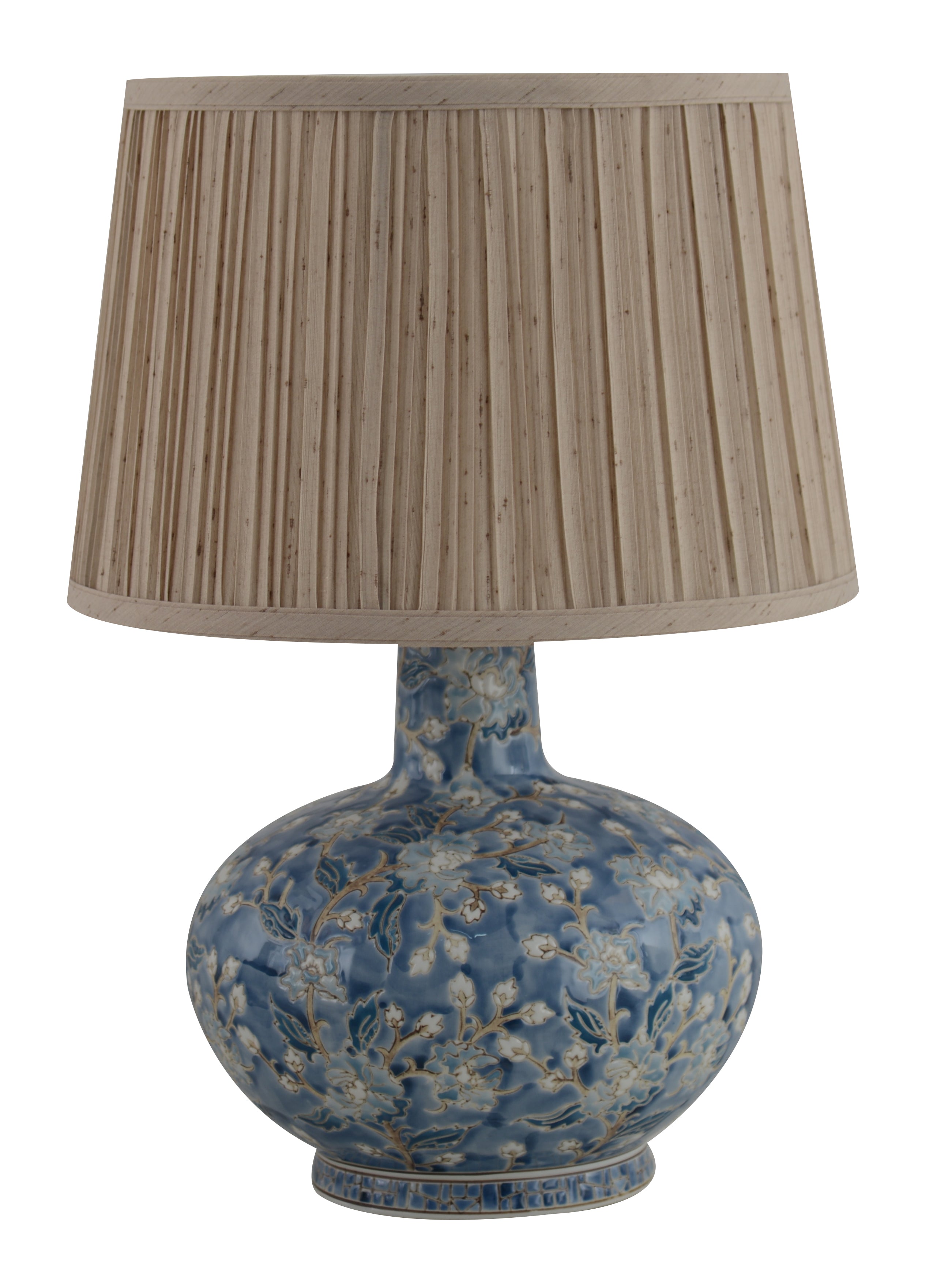 A softly pleated neutral shade sits above the patterned base and adds balance while diffusing a warm inviting glow. The generous proportions make this lamp ideal for a console table sideboard or bedside where it can be appreciated as both a functional and decorative statement.