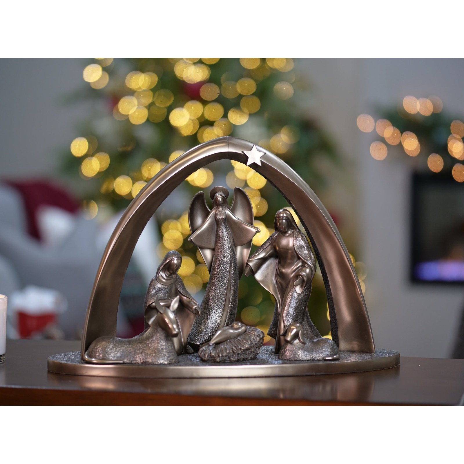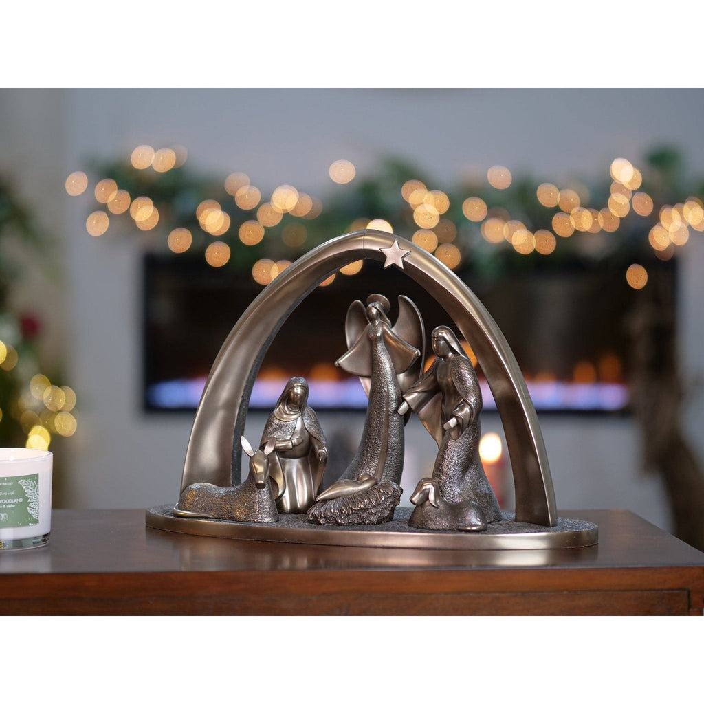 • Un belén de bronce hecho a mano que incluye un ángel que da vida a la historia de la Navidad.