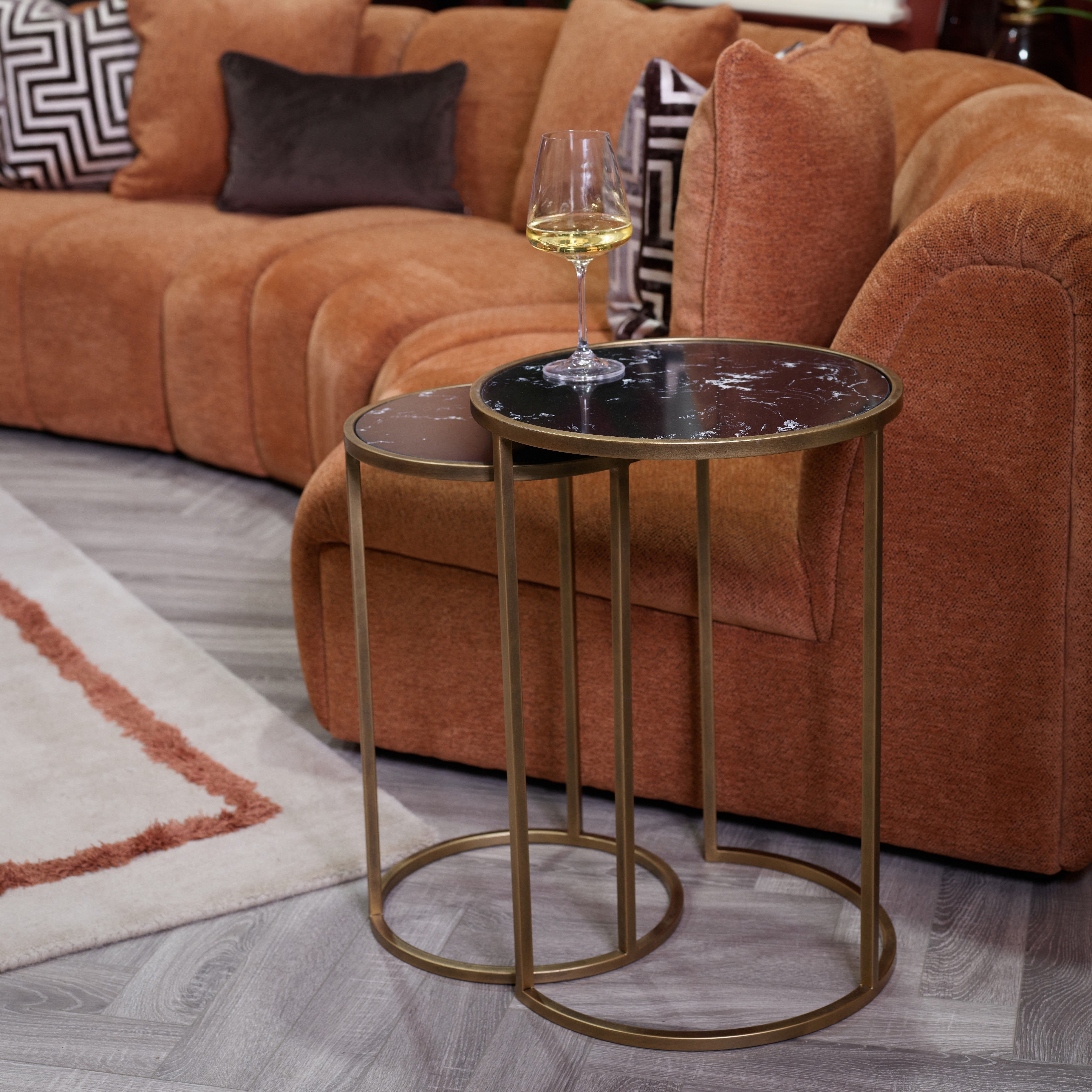 The Arlo Nested Tables in black create a striking contrast of dark stone effect surfaces and warm metallic framing. The deep tones of the tabletops add drama and sophistication while the rounded edges soften the overall look. This combination results in a bold yet balanced design.