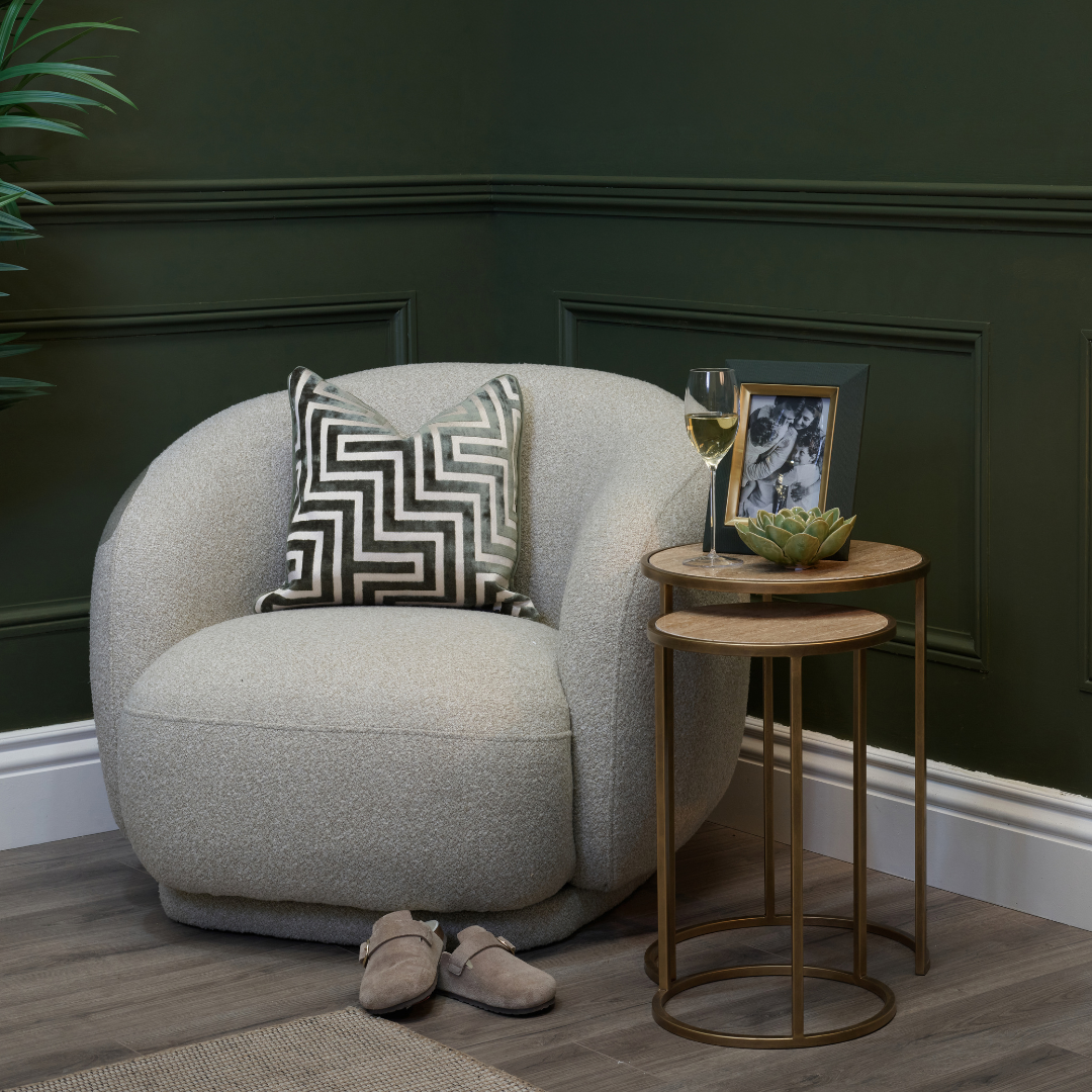 The Nadia Swival Chair offers a cocooning sense of comfort through its rounded enveloping form. Upholstered in a soft neutral fabric the chair invites relaxation while its sculptural shape adds visual interest to the room. The deep seat and supportive back create a luxurious seating experience.