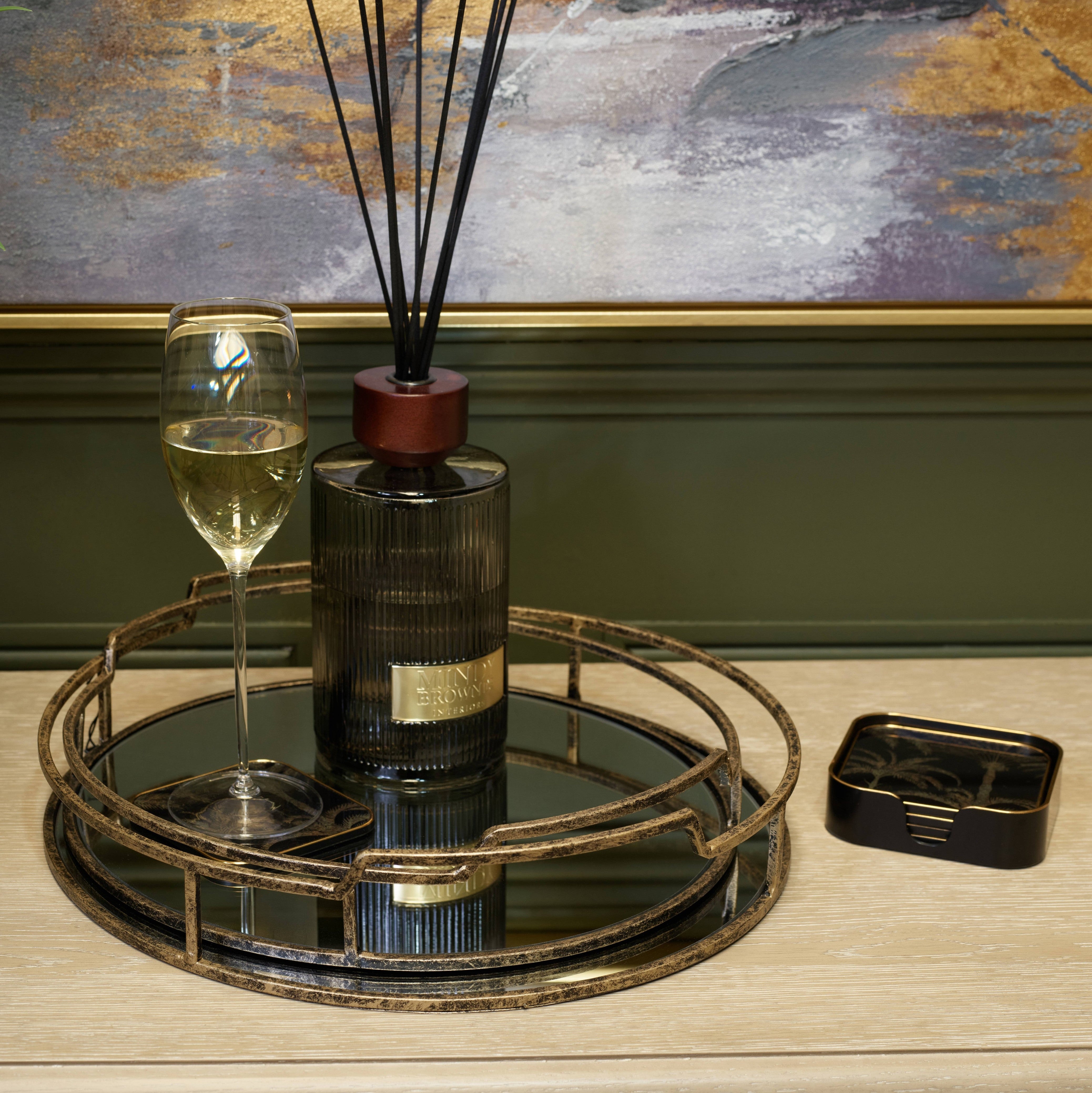 Posavasos dorados y dorados inspirados en palmeras, tu accesorio perfecto para fiestas o mesas de café.