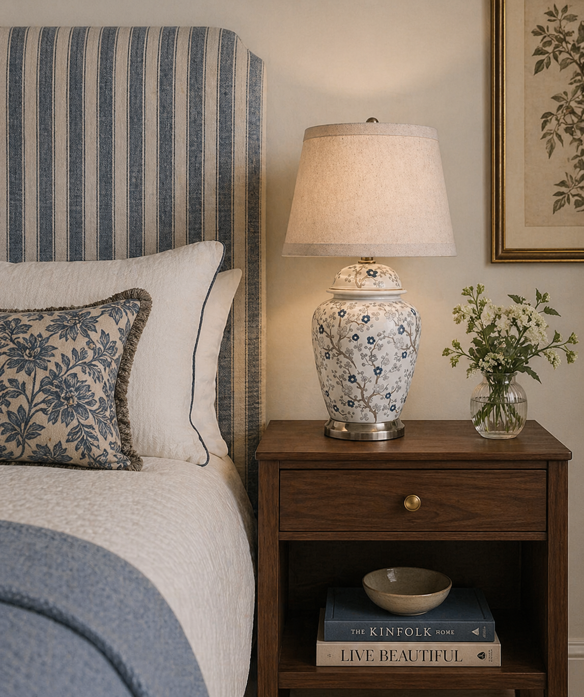 The Siya Lamp blends elegant floral detailing with a soft, timeless design. Its blue floral and vine patterned base is paired with a beige shade that casts a warm, inviting glow, creating a calm and decorative finish.