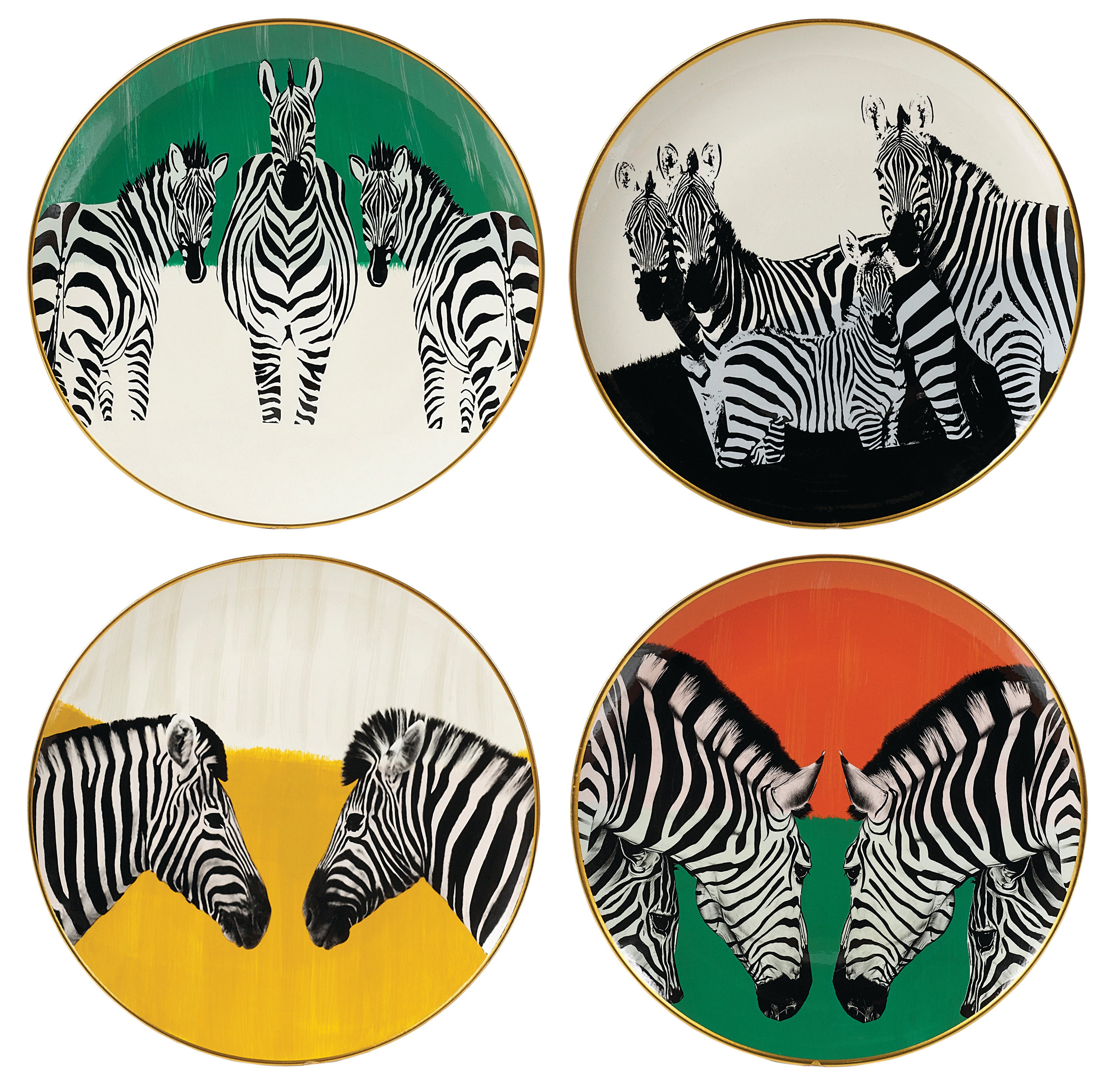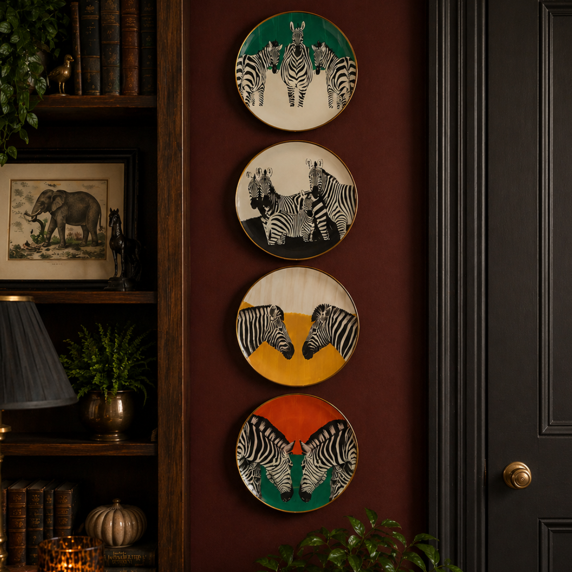 Bring bold, modern safari style into your home with this striking set of decorative zebra wall plates. Each plate features a unique graphic composition of zebras, blending clean black-and-white illustration with vibrant, contemporary backgrounds in rich green, warm ochre, soft neutral, and sunset red. The result is a curated collection that feels both artistic and effortlessly cohesive.
