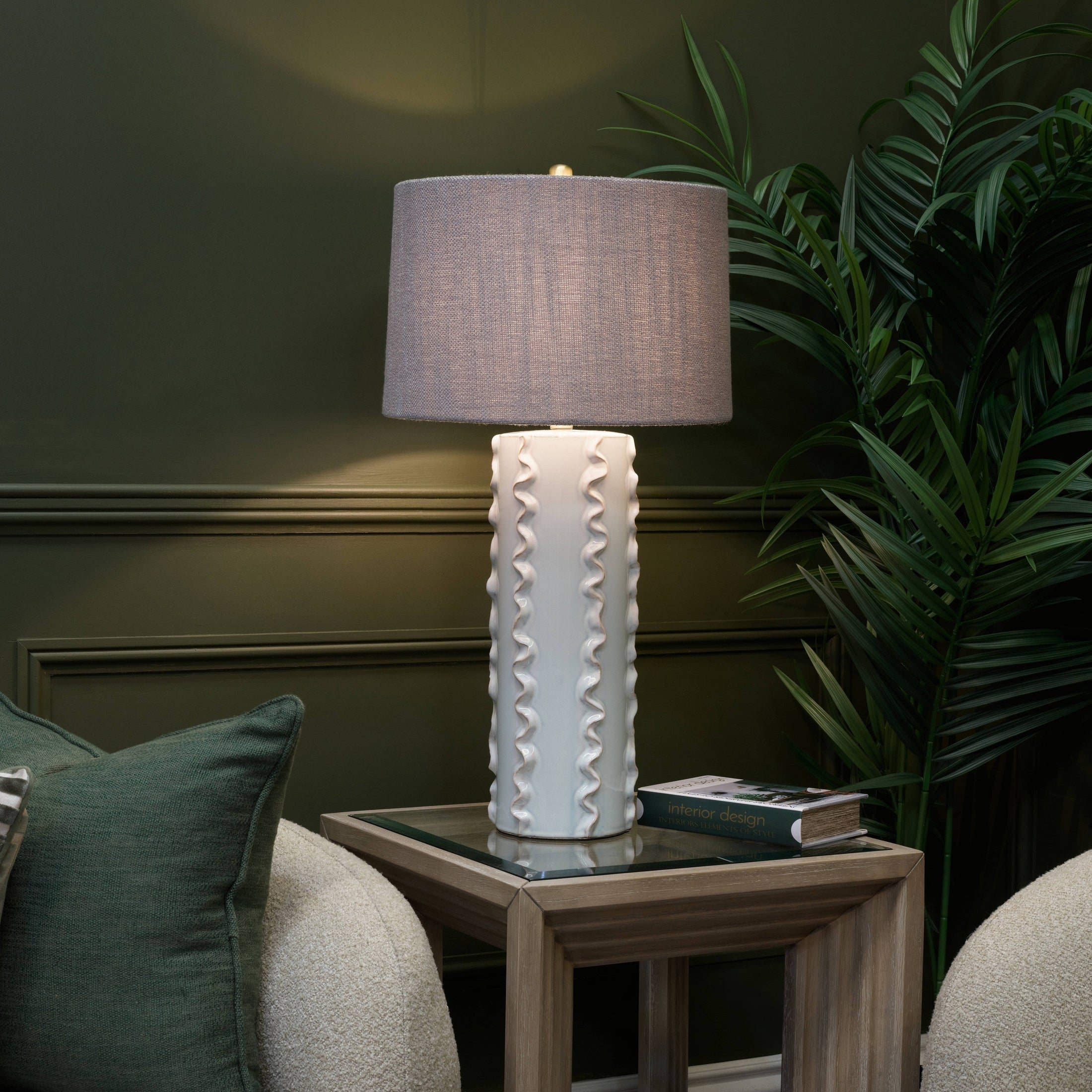 The Emily Lamp offers a modern take on textured ceramic design. Its tall base features soft vertical detailing with subtle tonal variation, creating movement while maintaining a calm, neutral look. Finished with a fabric shade, it casts a gentle, ambient glow that highlights its sculptural form.